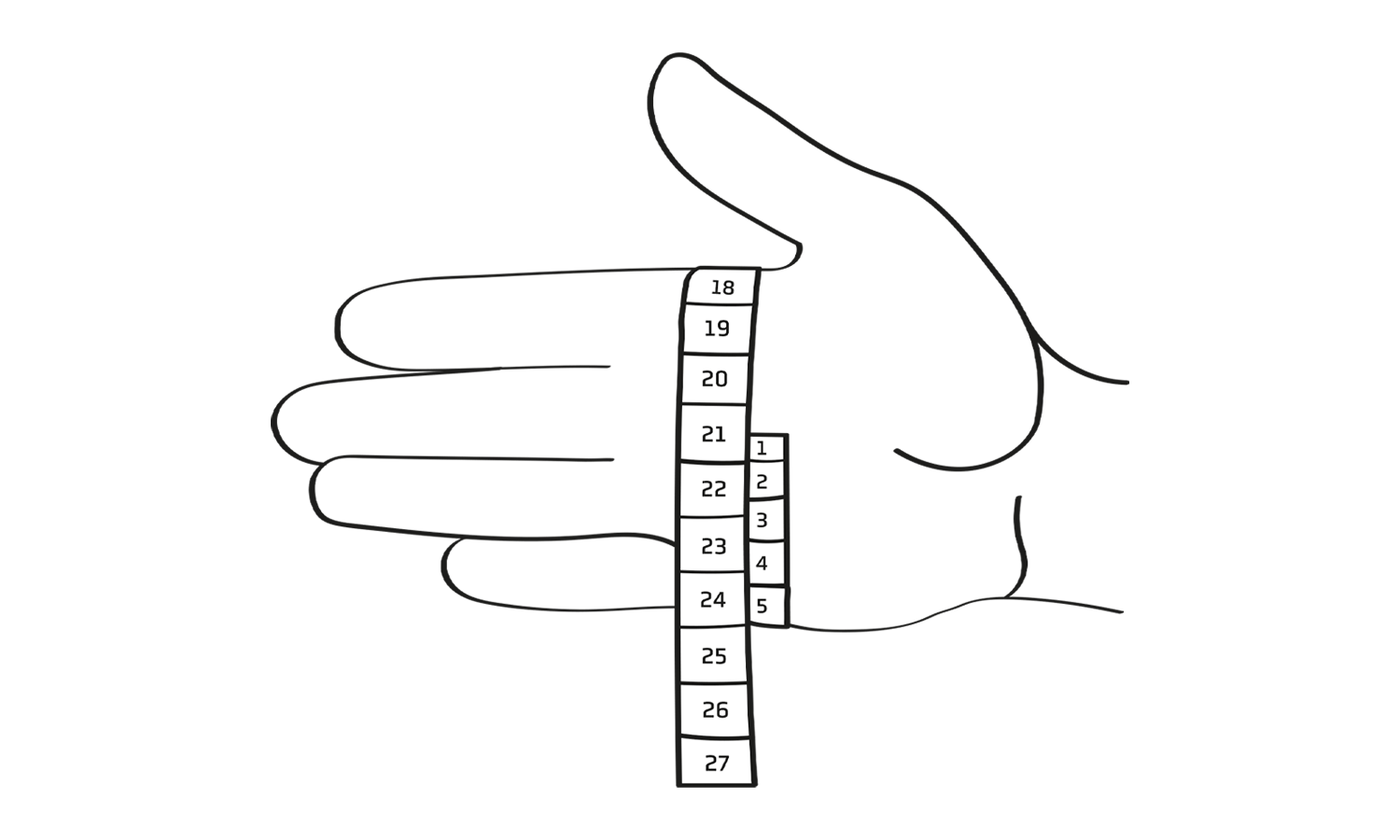 Nimm ein Maßband und lege es an der breitesten Stelle eng um deine flache Hand – direkt unterhalb der Fingerknöchel. Der Daumen bleibt dabei außen vor. Lies anschließend den gemessenen Wert ab.